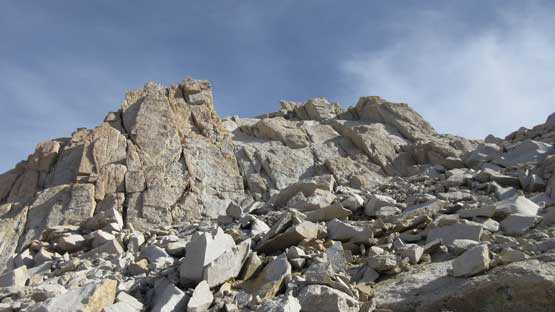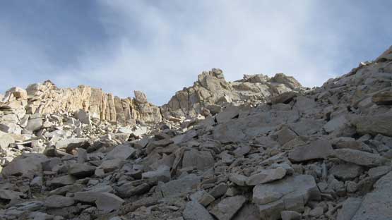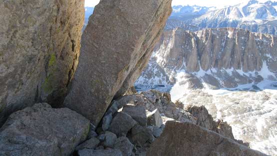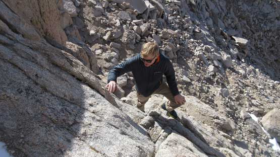 It’s very obvious as where to leave the trail as long as you’ve done some sort of research. To get to the summit block was just an “easy scramble” on talus and scree. There’s plenty of route information for the 3rd class section on this final pitch but once there the route-finding is actually quite simple. We pretty much just followed our basic sense and the natural flow and the route just worked out. There’s one trickier “hand traverse” about halfway up and then to get onto the true summit we had to squeeze up a “hidden chimney” on the backside. Both steps would qualify a “WA 4th class” or “BC 4th class” grade but here in California the rating is lower (3rd class).