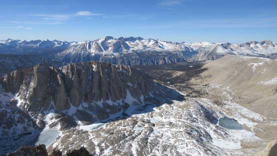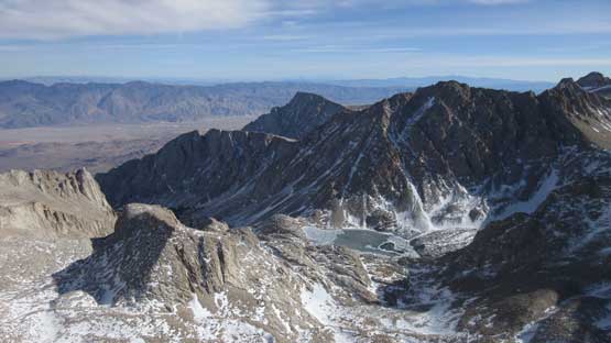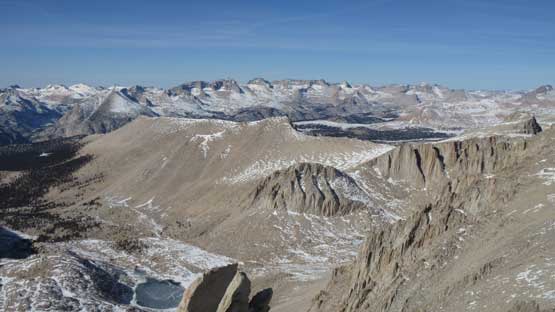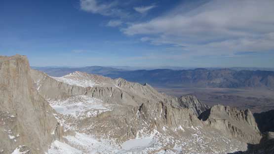 Thank to the pinnacle nature of this summit the view was actually more far-reaching compared to from Mt. Whitney. The lighting was gettin’ better too as that thin layer of high clouds was dissipating so we actually lingered for quite a while. The descent was straightforward. We didn’t want to fancy about the route so just simply retraced our exact ascent line. In no time we were back to where we ditched the backpacks.
