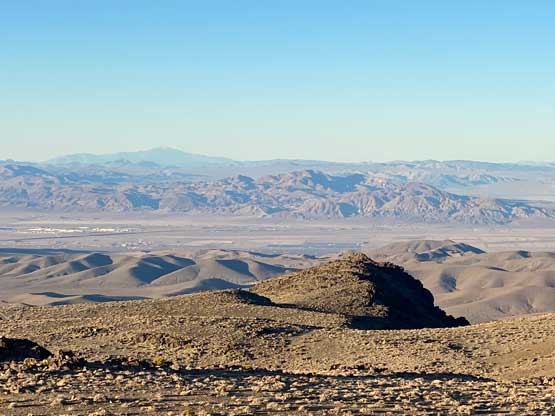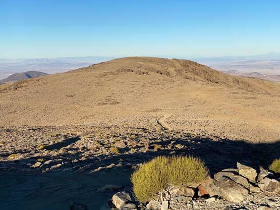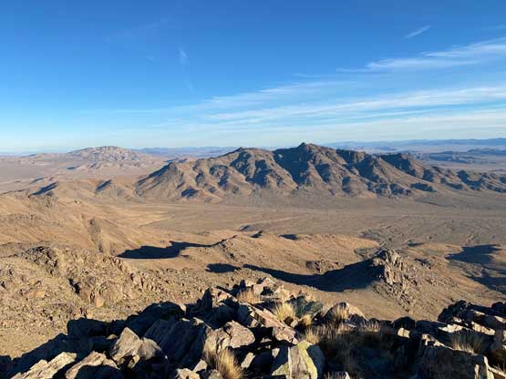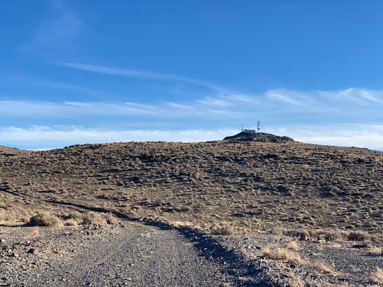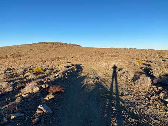 The ascent was nothing fancier than a road plod but turned out much better than expected. The late-afternoon lighting made the views more dramatic, and the desert landscape meant I had views the entire way. This was nothing like plodding up a FSR in BC where the only things to see are the trees. There was no tree in this area to obscure the views. This road was quite steep and rough such that I do not think I could have driven to the top, even if the gate was open. The summit was behind some communication structures so I had to do some brief scrambling to reach the highest point, where I got some more views towards south.
