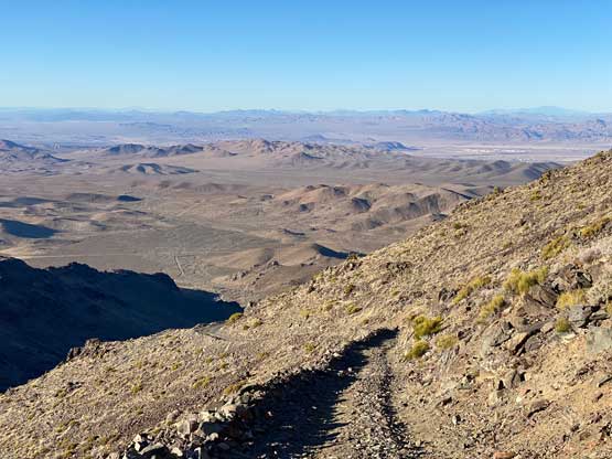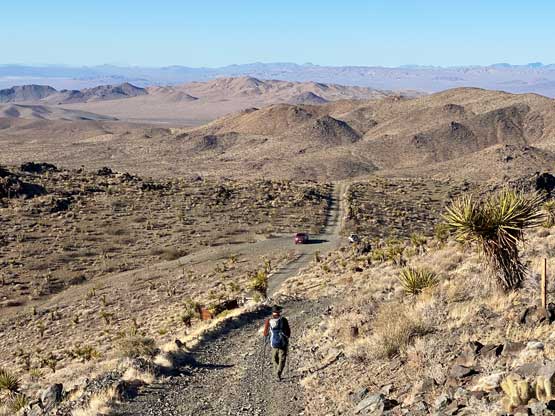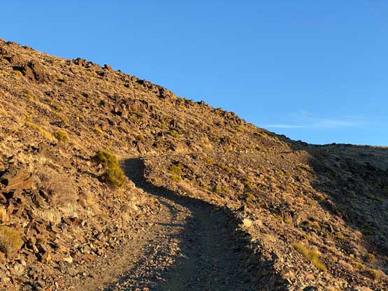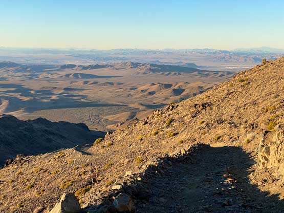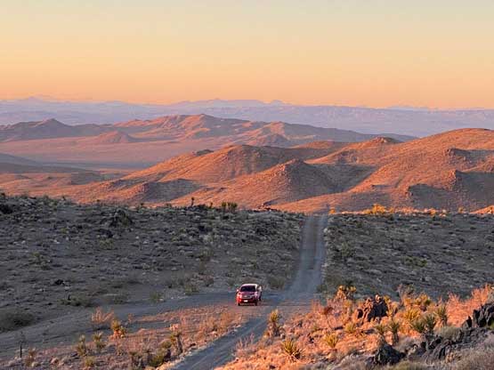 The time was getting on, so I hassled on the descent. As much as I liked to watch sunset from the summit I needed to get moving to not run behind schedule. On the descent I just plodded down the road but took one short-cut to eliminate one unnecessary switchback. I made back to the truck around sunset and subsequently drove down the rough roads. The downhill driving was always easier than on the way up and in short time I was back onto the freeway.