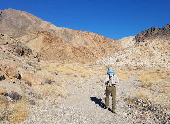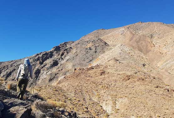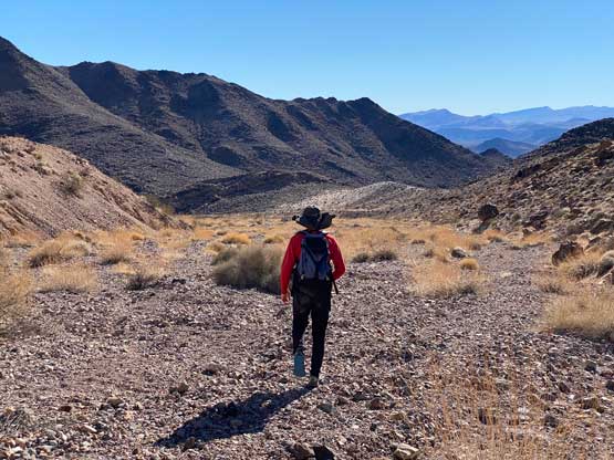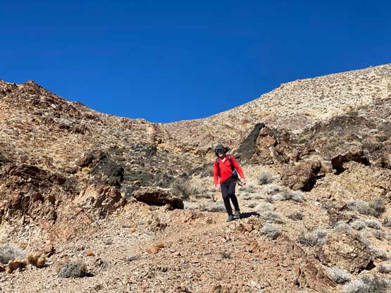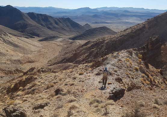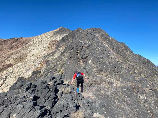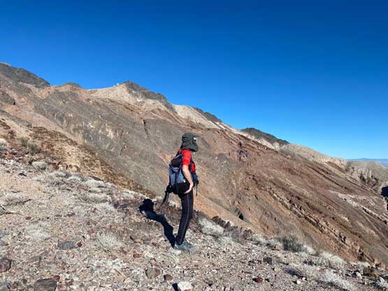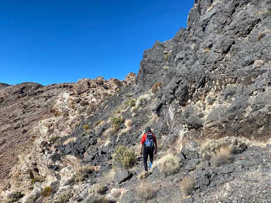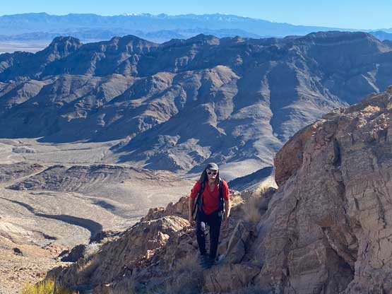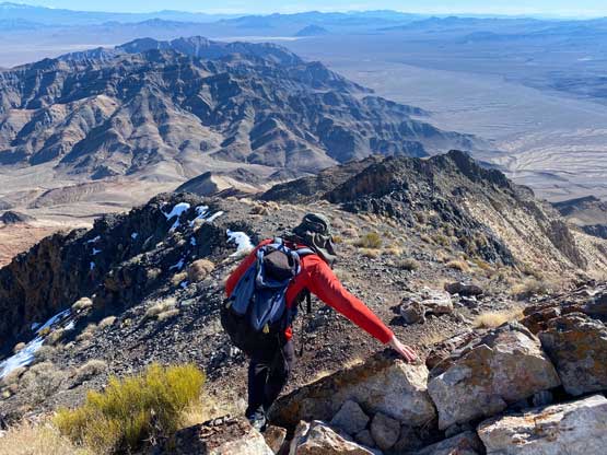 The scramble of Pyramid Peak would not consume a full day so Rob and I left the hotel in Pahrump fairly late in the morning. Rob drove us in his rental Rav4 to the parking spot a few kilometers outside the park’s boundary so we did not need to purchase a park pass, even though the peak itself is inside the park. The first hour and half of this ascent was a boring slog across the desert floor for about 4 km with some gentle elevation gain. Checking the GPS later I think we did a good job plodding a straight line from the vehicle to the base of Pyramid Peak. There were some micro-terrain including some washes to cross, but nothing really worth noting. The desert floor eventually gave way to a valley which we followed to the “SE Gully” on Pyramid Peak’s access side. From there we picked up a hiker’s path and easily hiked and scrambled onto the east ridge. We took our first break about 50 m elevation under the east ridge.