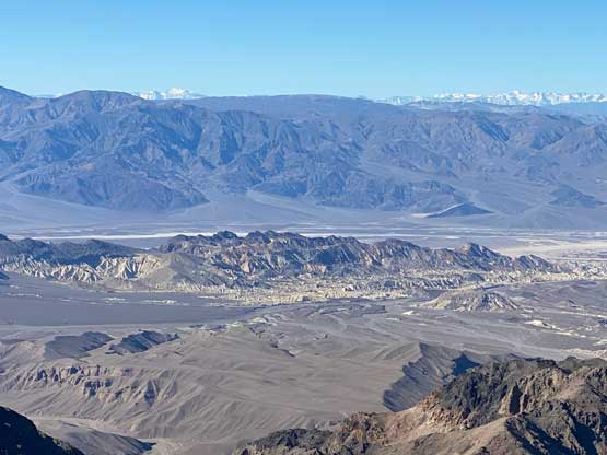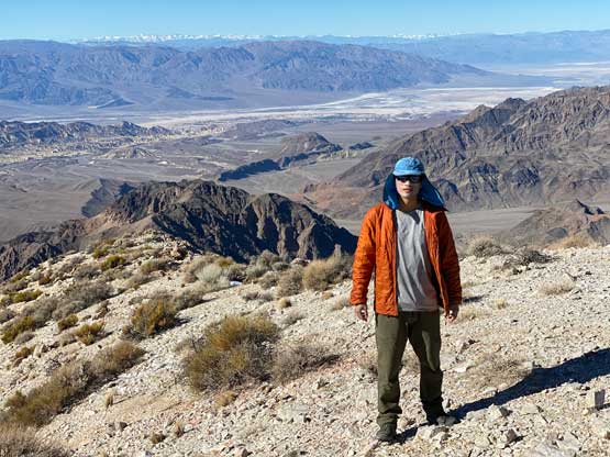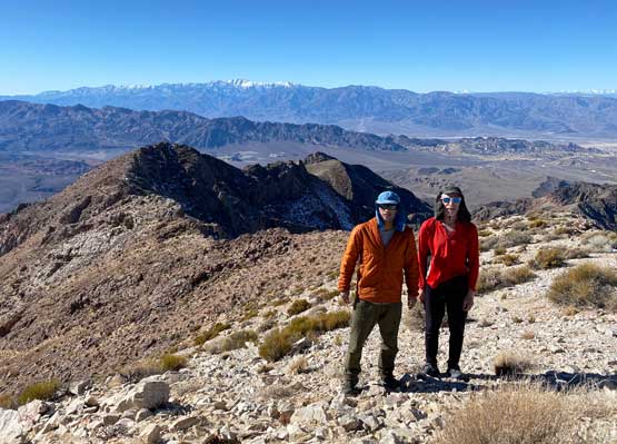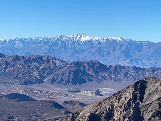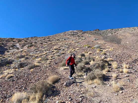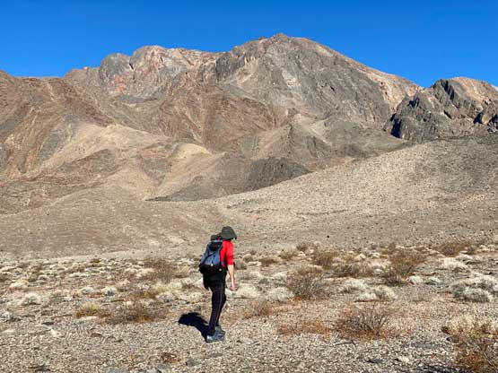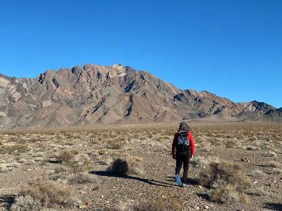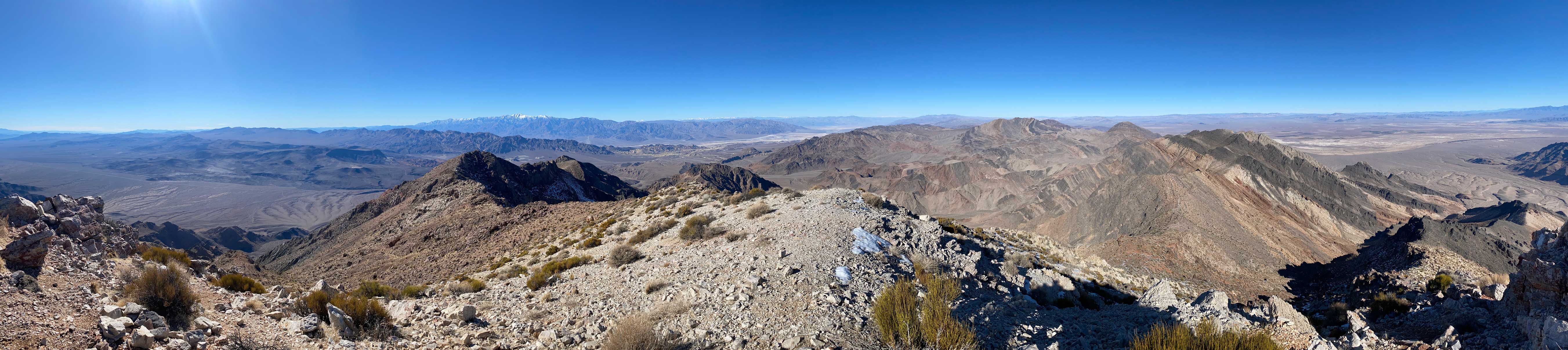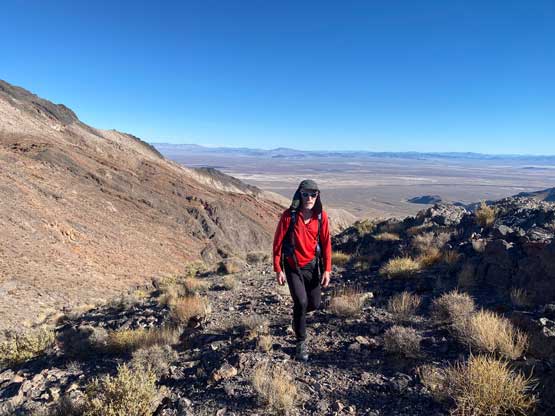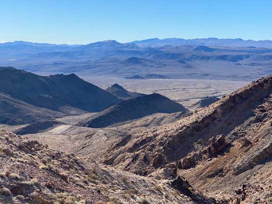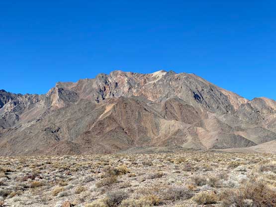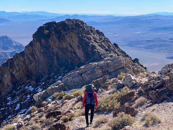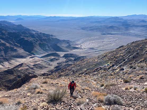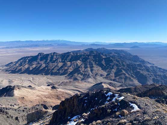 After taking in enough of the views we descended quickly following basically the exact route we had taken on the ascent. The summit ridge traverse was still relatively fun, but the plod down the east ridge back into the valley was less fun. We did manage to surf on the scree here and there to speed up the progress but the scree runs were never continuously long. Eventually we descended back onto the desert floor and faced that numbing slog. Rob was very fast on this flat terrain such that I eventually gave up and just walked back on my own pace, about 10 minutes slower in the end. Our round trip time was under 5 hours so this was a short hike, but not quite a half-day outing considering the short daylight time in January. Rob and I talked about to tag Funeral Peak in the afternoon and possibly summiting at sunset, but decided to just drive back to Las Vegas to have an easier day.