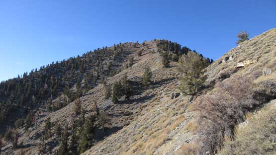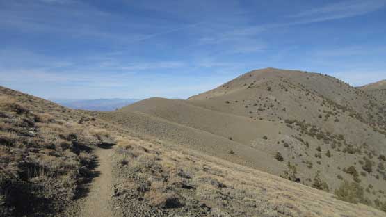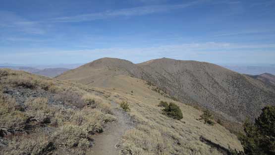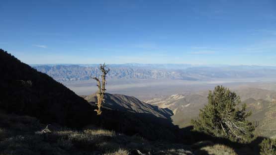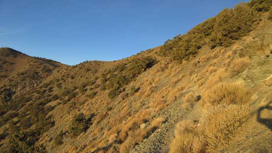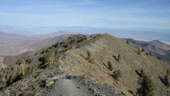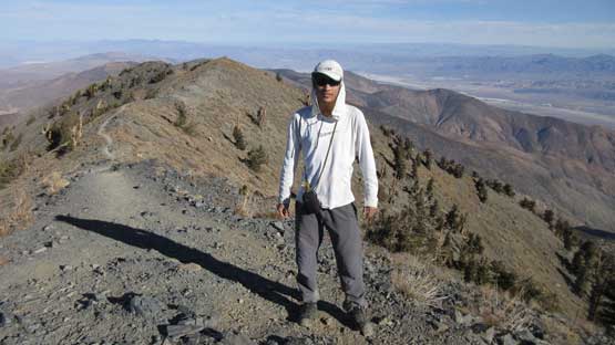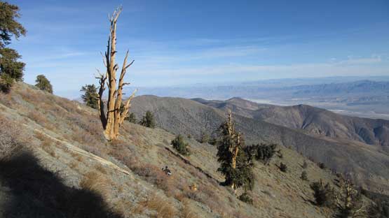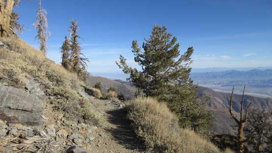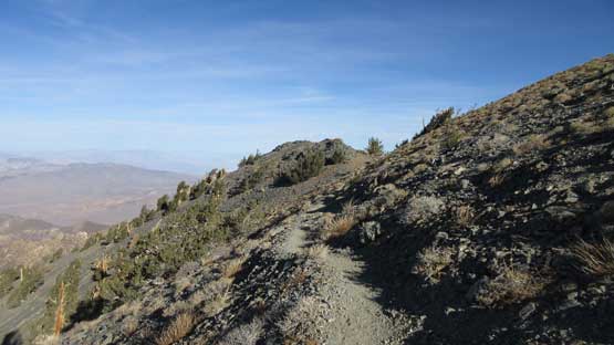It started to get chilly so we resumed on. The next section of this trail traverse around the west side of Bennett Peak and was entirely in the shade. We cruised across as fast as possible and the next destination was Bennett/Telescope col which is actually lower than Rogers/Bennett col. From here looking upwards the ascent of Telescope Peak via north ridge seems like a “short walk”, but I can assure you here that the view is very foreshortening. There’s actually about 500 m elevation gain which will definitely feel like a drag towards the end. The upside is that the grade of those switchbacks seems reasonable and then the summit view is amazingly outstanding.