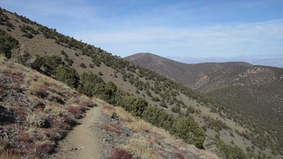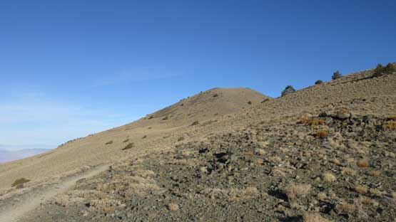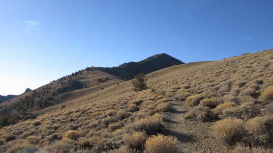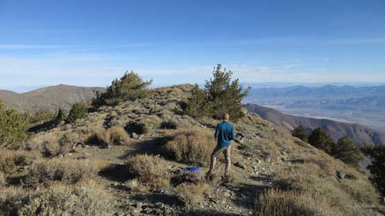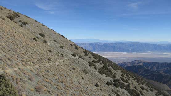 It started to get chilly so we resumed on. The next section of this trail traverse around the west side of Bennett Peak and was entirely in the shade. We cruised across as fast as possible and the next destination was Bennett/Telescope col which is actually lower than Rogers/Bennett col. From here looking upwards the ascent of Telescope Peak via north ridge seems like a “short walk”, but I can assure you here that the view is very foreshortening. There’s actually about 500 m elevation gain which will definitely feel like a drag towards the end. The upside is that the grade of those switchbacks seems reasonable and then the summit view is amazingly outstanding.