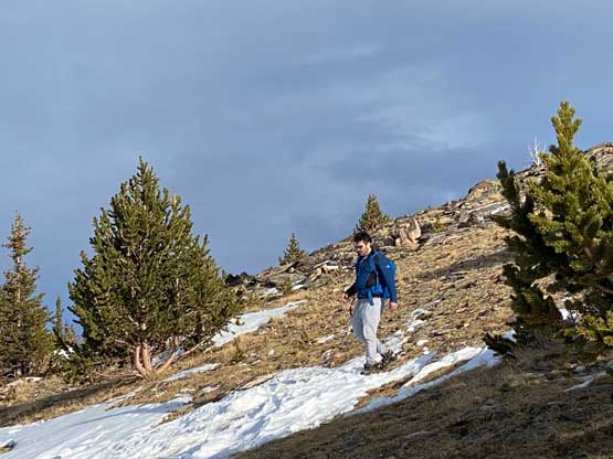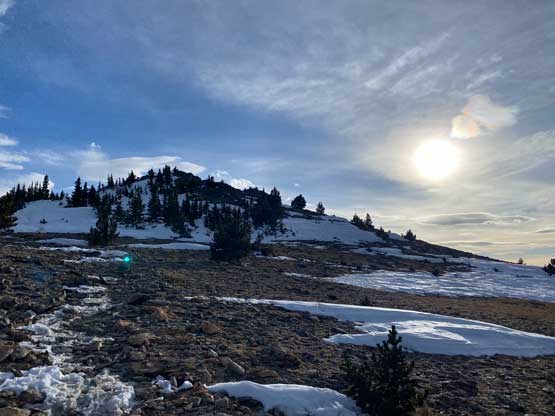 I stayed on the summit for about half an hour to soak in the views. I was hoping to stay longer for better acclimatization but then I decided to use the spare time to ascend Papoose Mountain nearby. This bonus peak looked to be completely forested but it’s officially-named so I had to tag it. After descending back to Chief/Papoose saddle I could not find a set of tracks heading up Papoose Mountain, so I spent a minute or two to don snowshoes.
