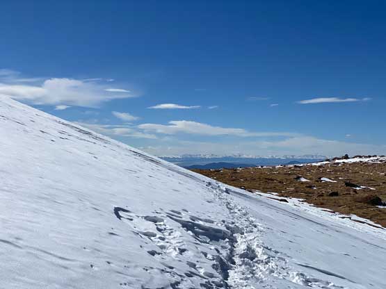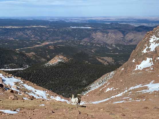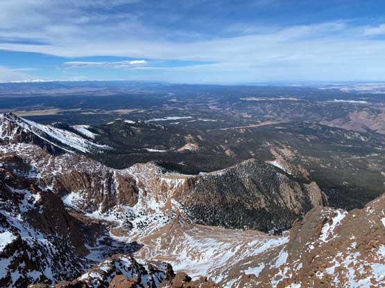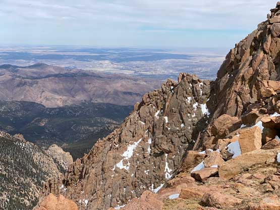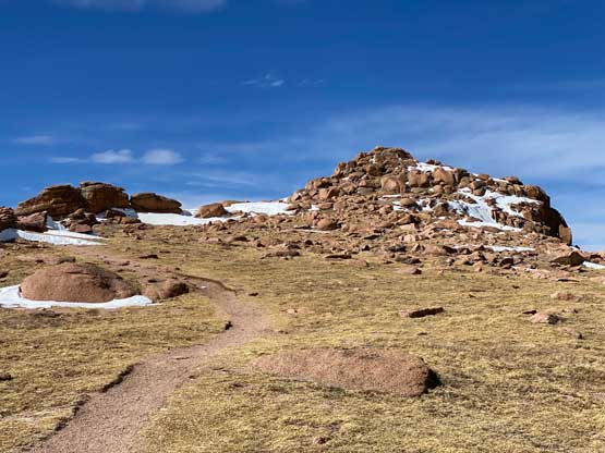I opted to carry very little loads and wear trail-runners even though there appeared to have snow on the mountain. After gaining about 50 m elevation I picked up some trails that traversed across the north side of “Little Pikes Peak”. There were some patches of snow but the paths had been packed by previous hikers so I did not have to suffer from post-holing. The temperature was nuclear warm at this altitude in March, but as long as I didn’t need to do extensive snow travel things should be fine. I rejoined the road on the east side of that peaklet and followed it for a short distance. I made sure that no service car was running on the road so nobody could come to me face to face to kick me out of the mountain. As soon as I found another trail I left the road sticking closer to the NW Ridge of Pikes Peak.