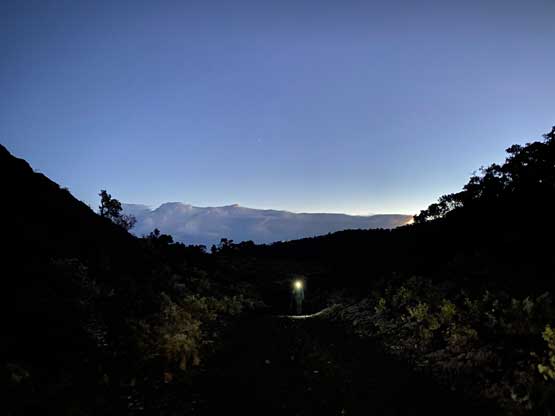 There’s literally only one logical spot to hop over the initial gate with fence around. It’s obvious that many hikers had entered into the sacred lands from this way judging by the mangled state of the barbed wire fence. The second blockage was a gate 100 m from the first one (barbed wire fence) and two of us hopped over while I ducked under. The navigation could be tricky in the maze of dirt roads back in the pre-GPX era but we had downloaded two sets of tracks so it wasn’t a problem. The ascent turned out to be mostly plodding on dirt roads. Raphael made a point that we should hike faster in case the authorities came on some ATVs from behind and I agreed. At around 1850 m elevation the road turned southwards and this marked the beginning of a long stretch of traversing with minor up-and-downs. The end of this stretch had a private house so we made sure to be quiet while sneaking beside. There wasn’t a vehicle parked so I didn’t think anybody would be inside, but we still played cautiously just in case. The sky had also turned bright enough that head-lamps were no longer needed.