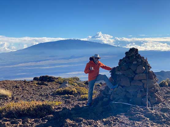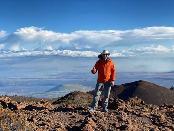 Raphael on the summit of Pu’uhonua’ula with Mauna Loa behind