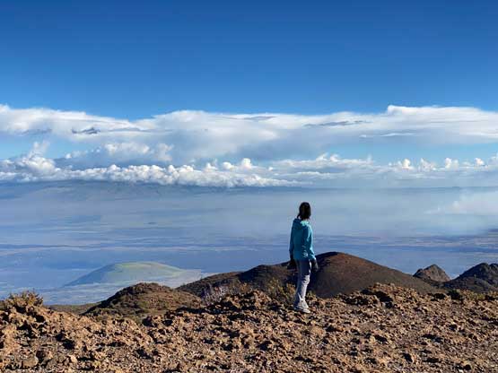 Nikita on the summit with Kohala Mountains behind in the clouds