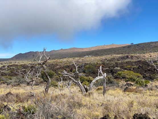 After grabbing the packs we ascended the easy west slopes of the true summit of Hualalai and the travel was again, very straightforward. Despite the sacred status there’s a summit register full of entries. The weather had been much nicer than forecasted and we could see the summit of Mauna Kea free of clouds. This meant we could actually have done Mauna Kea in this morning. The forecast was predicting Wednesday (Day 4) to be the best window so that’s why we didn’t do the main objective first. Nonetheless given the excellent weather we lingered on the summit for almost an hour before agreeing to descend.