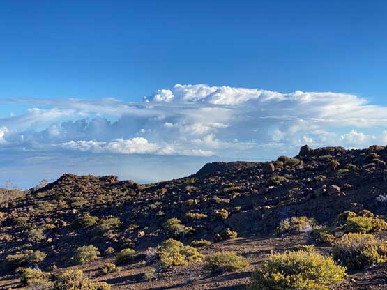 After grabbing the packs we ascended the easy west slopes of the true summit of Hualalai and the travel was again, very straightforward. Despite the sacred status there’s a summit register full of entries. The weather had been much nicer than forecasted and we could see the summit of Mauna Kea free of clouds. This meant we could actually have done Mauna Kea in this morning. The forecast was predicting Wednesday (Day 4) to be the best window so that’s why we didn’t do the main objective first. Nonetheless given the excellent weather we lingered on the summit for almost an hour before agreeing to descend.