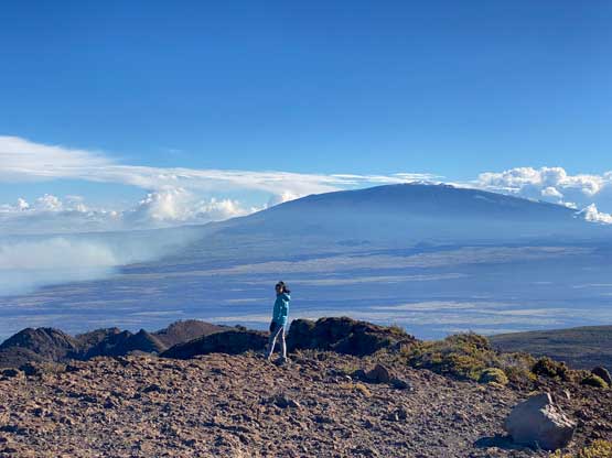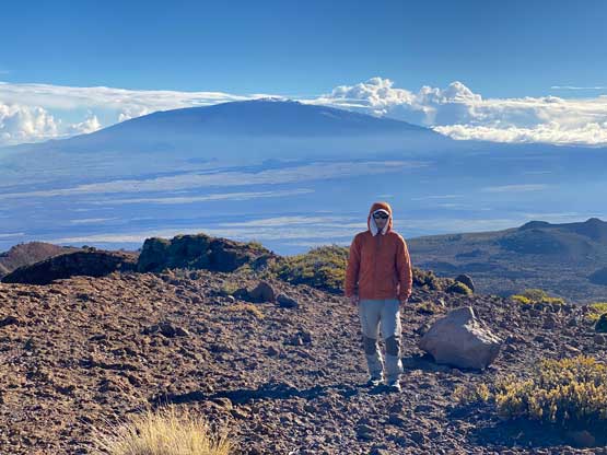 Raphael on the summit of Pu’uhonua’ula with Mauna Loa behind