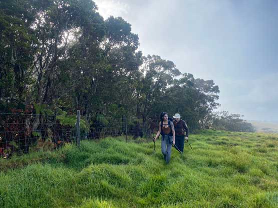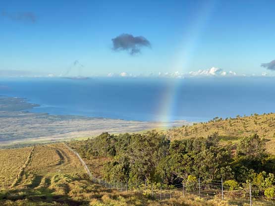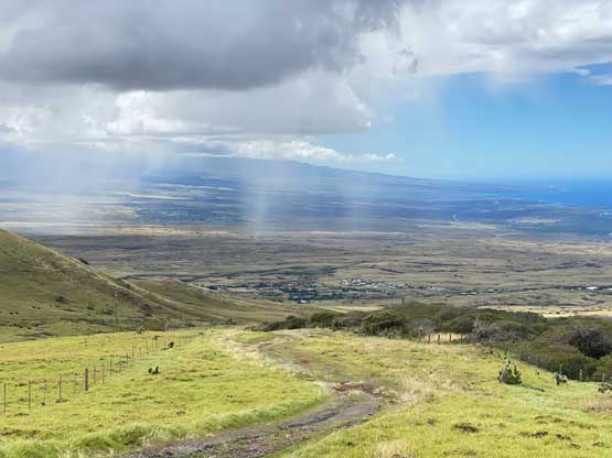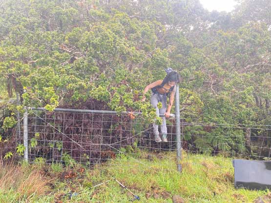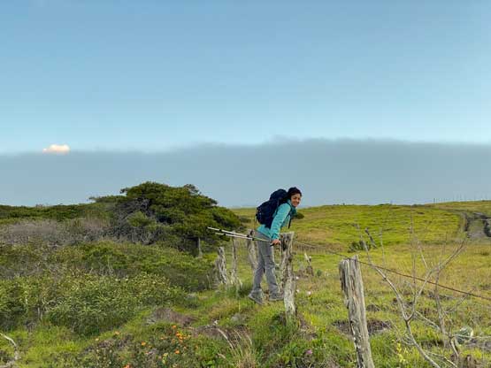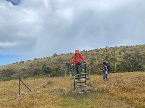 We should have just started the ascent by walking the ATV road but somehow decided to enter the tree sanctuary. The trails in the sanctuary wouldn’t lead us anywhere so a short while later we hopped the fence and went onto the ATV/Jeep road. The next stage was simply plodding up the road to the end and the views were amazing behind. The clouds were being pushed across Kohala Mountains from the north side but they wouldn’t reach this far down low on the lee side. We had clear skies until near the end of the road when we suddenly entered the drizzle. The vegetation had also changed abruptly from cactus to jungles. The “beta” wasn’t very clear about the section from the end of the road to the hunter’s trail below Eke. On the ascent we opted for the more obvious way by staying adjacent to the fence line and it was harder than it sounded like. For the most parts we were able to pick up game trails but we also needed to push through sections of thick brushes. We were thoroughly soaked by the wet bushes and the rain before even entering the real jungles. Numerous fence lines and gates also needed to be hopped over, so we talked about to descend a different variation a few hours later, which did not turn out to be an obviously better choice.
