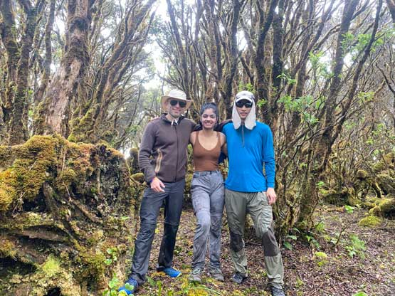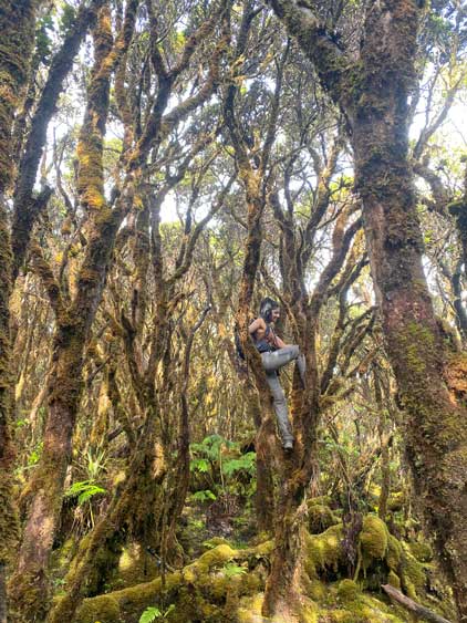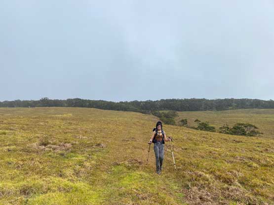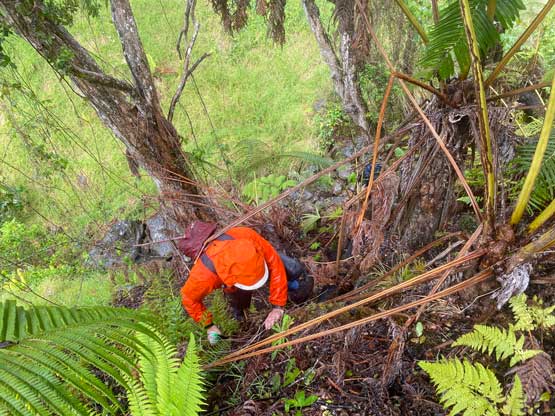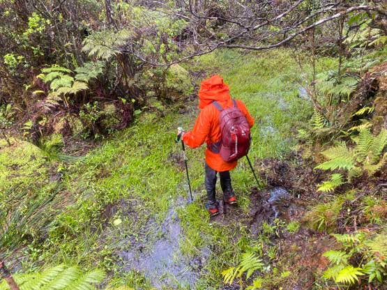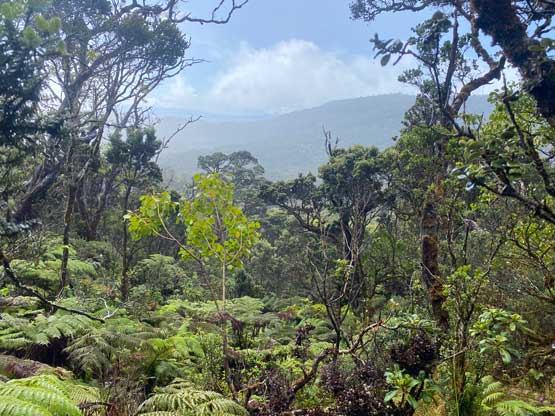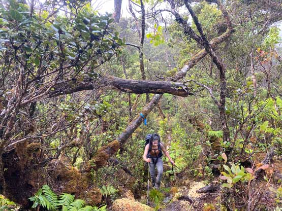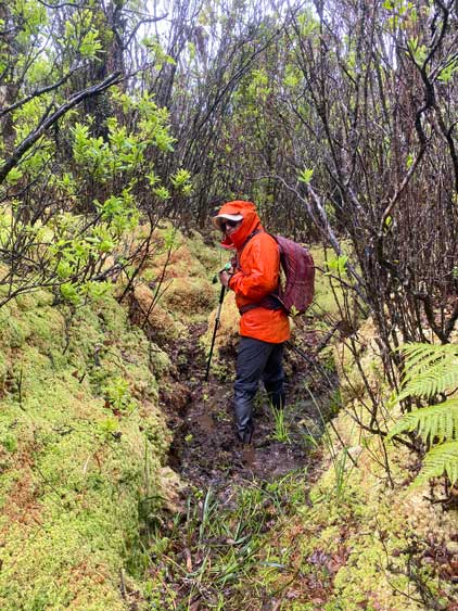 We ascended over the west shoulder of Eke and dropped about 50 vertical meters down into the broad saddle between Eke and Kaumu o Kaleihoohie. The weather had turned into a steady rain by this point even though we could see glimpses of blue skies above. The rain was purely from the moisture of the low-level clouds. Near the bottom of the saddle we encountered sections of swamps as mentioned in other trip reports. We were already soaked to the bone by this point so there’s no point in trying to stay dry. I simply post-holed through the swampy zones and sank shin deep at times. Raphael warned me the risk of losing the shoes in the mud and I quickly realized what I was doing was probably not that smart. The ascent of Kaumu o Kaleihoohie from the saddle was also more complicated than anticipated. It’s difficult to stay on route and the path was steep and scrambly. The ascent also took longer than expected and required some degree of perseverance. The true summit was also completely forested with no view whatsoever but it didn’t matter that much. It’s probably raining 350 days a year here anyway.