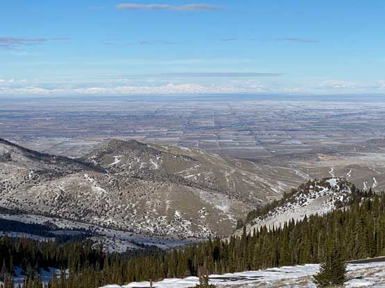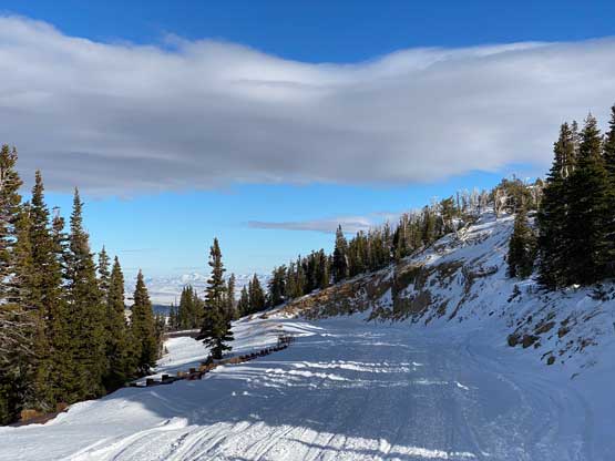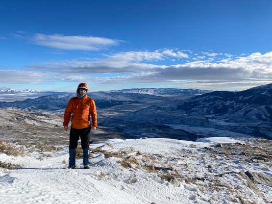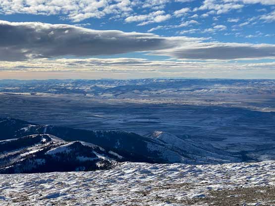 I had about 3 hours of daylight time left so there wasn’t any need to rush anymore. Despite the snowmobile tracks I still carried snowshoes which turned out to be a good call. After about a kilometer I had to strap the snowshoes on but then the road became bare so I had to take them off. The road became snowy again after entering some shady areas but I did not need snowshoes until much higher up near a switchback feature. I decided to just short-cut this switchback through untracked powder, and the trail-breaking was brutal. The snow was bottomless that I sank knee deep to the ground despite the snowshoes. At this point I decided against any major winter ascent in Idaho, Utah or northern Nevada as I did not want to deal with solo trail-breaking. The upper roads were snowy enough that I managed to snowshoe all the way to the summit. The plod felt like a slog in the end but the views were excellent.