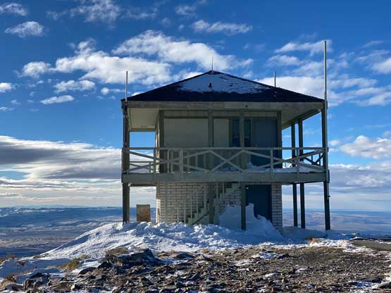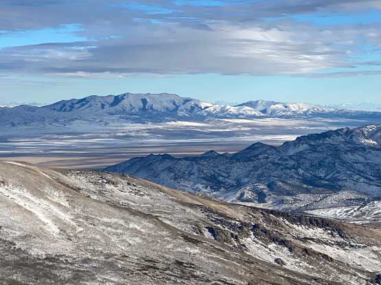 I had about 3 hours of daylight time left so there wasn’t any need to rush anymore. Despite the snowmobile tracks I still carried snowshoes which turned out to be a good call. After about a kilometer I had to strap the snowshoes on but then the road became bare so I had to take them off. The road became snowy again after entering some shady areas but I did not need snowshoes until much higher up near a switchback feature. I decided to just short-cut this switchback through untracked powder, and the trail-breaking was brutal. The snow was bottomless that I sank knee deep to the ground despite the snowshoes. At this point I decided against any major winter ascent in Idaho, Utah or northern Nevada as I did not want to deal with solo trail-breaking. The upper roads were snowy enough that I managed to snowshoe all the way to the summit. The plod felt like a slog in the end but the views were excellent.