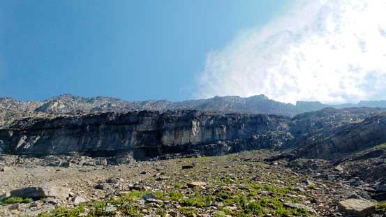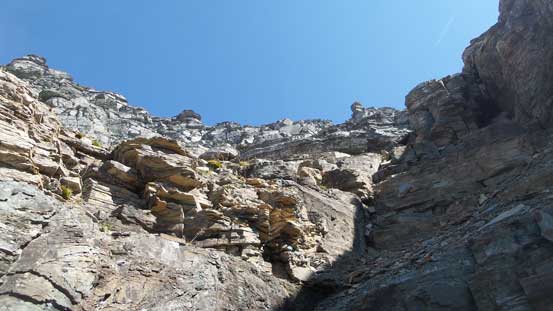 At the saddle I switched my footwear to the mountaineering boots and then upwards and onwards ascending the W. Face loosely following Sonny Bou’s trip report. We knew this route went roughly at Class 4 scramble via an obvious diagonal gully system then transitioning to the upper SW Face. The gully was very easy to spot and not far up we found ourselves working our way through a series of rock steps and then the lower cliff band. They all required route-finding here-and-there but nothing overly tricky. Once above the lower cliff bands the terrain angle eased a bit and it’s mostly a scree slog on horribly loose ground for the next short while.