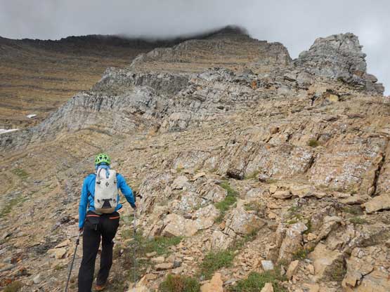 The 2-mile traverse across the faces of Mt. Pinchot wasn’t clearly described on any beta, so we were in for some route-finding and decision making. The first business was to gain ~200 feet (60 m) above Pinchot/Eaglehead col and that’s pretty much the only useful beta we had. After that all we knew was to start contouring. The traverse can be broken down into two stages – the first, easier stage across the SW Face of Mt. Pinchot on some scree benches and the second stage across the NW Face of Mt. Pinchot on a narrow scree ledge. The key on the SW Face traverse was to not gain much elevation. I wasn’t fully convinced but the occasional cairns and paths kept our bearing down. Around a corner I thought we had to aim for a broader scree bench at about 100 vertical meters higher, but again, cairns and paths kept us staying low on some narrow ledges sandwiched between shear cliffs. The traverse was much easier than appeared but seemed never-ending. There actually wasn’t much route-finding decisions to be made on the NW Face section because we literally only had one way to go. The ledges weren’t flat but we actually lost more elevation than gained, so keep that in mind. The last 1/3 was a bit undefined but had the least exposure. The low saddle between Mt. Stimson and Mt. Pinchot is more than 800 vertical meters below the summit.