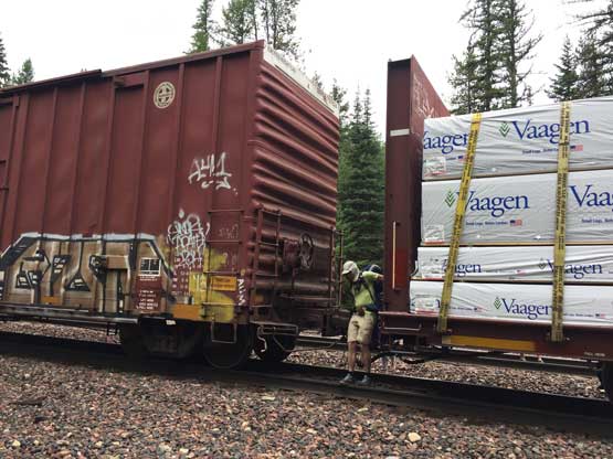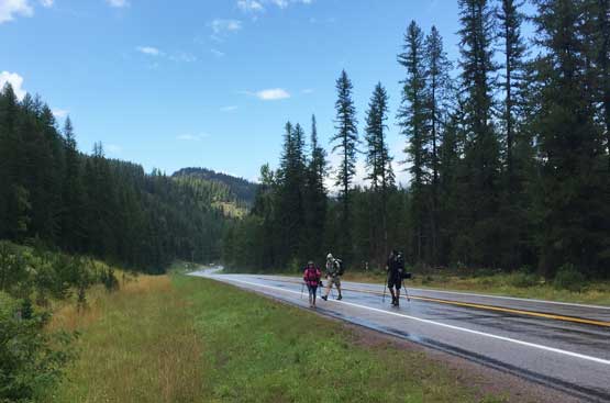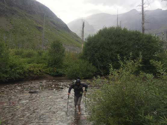 The morning of Sunday (Day 4) we woke up under some similar weather and did some routine packing and cooking thing. Unfortunately for us, the weather collapsed as soon as we got down to the main Coal Creek trail and the rain literally never stopped until later that afternoon in West Glacier. In no time we were soaked to the bone from the wet brushes. There was actually not that much worth documenting about the rainy hike-out because all we needed was following the trail out. I somehow decided to not use rain gear at all and somehow managed to stay warm for a few hours all the way until Coal Creek campground. Adam and I had to do a short detour retrieving some ditched equipment and meanwhile I did a quick change of clothing. I abandoned the wet t-shirt and pants and went for rain jacket and rain pants and felt much more pleasant. My shoes were so soaked that I didn’t even bother to take the shoes off for the last crossing of Coal Creek. We also marched back at a ridiculously fast pace because we believed speed could overtake the misery. I also didn’t bother to swap shoes for sandals on the final crossing of Middle Fork Flathead River. The river was thigh deep now, but didn’t impose much of a problem. The train wasn’t there anymore but the crux might actually be the road crossing at the very end. This road was very busy and the cars were very fast…