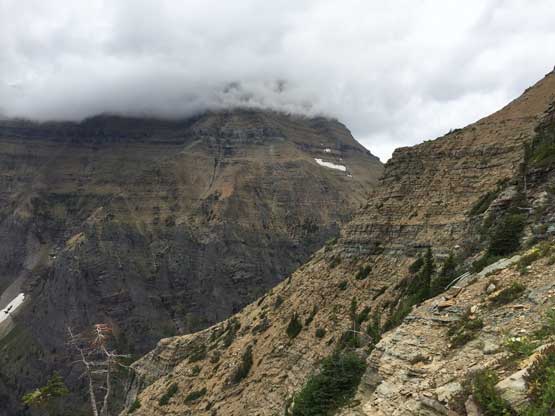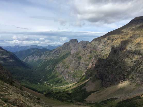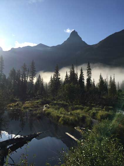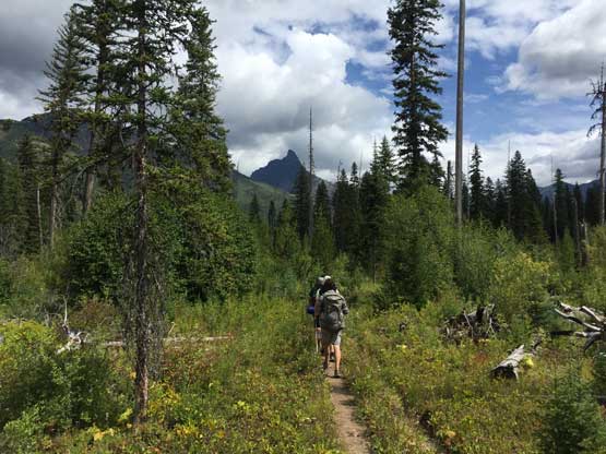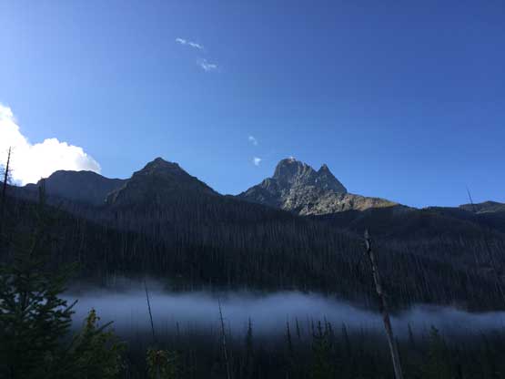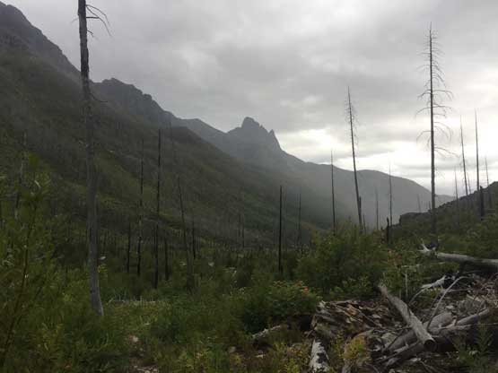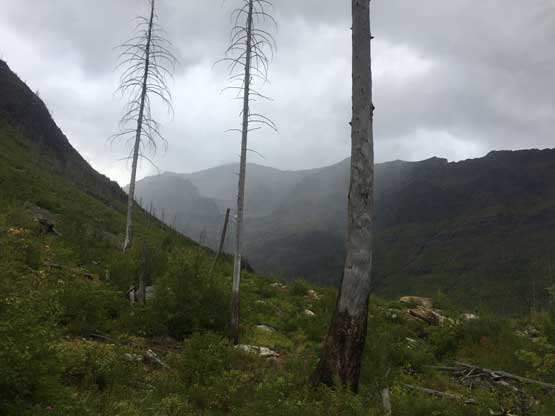 The weather forecast had downgraded towards the last minute and we were definitely in for some rain, at some point during the trip. The first day had chances of thunderstorms but the next two days were supposed decent, before weather collapsing on the 4th day. In the morning of Thursday (Day 1) we sorted the last minute permit things in the backcountry office at West Glacier and drove to the trail-head, a mere 15 miles away. Right off the bat we had to cross a busy highway, a train track with a parked train, and then ford the Middle Fork of Flathead River. The fording was not difficult but did appear somewhat daunting. The water was crystal clear to see the depth of the river, but the rocks were extremely slippery. After the river crux we picked up Coal Creek trail and our next business was a 6-mile death march to Coal Creek Camp, our destination of Day 1. There wasn’t much see from this boring stretch other than the striking Mt. St. Nicholas but I was happy to be finally back in this park after my first visit in August 2015 from Edmonton, Alberta. The rain did hold off nicely allowing a dry hike. There were some rain drops after setting up the tents but nothing affecting us. The rest of the day was spent chatting, cooking and making a bonfire. Backcountry fire was allowed in the Coal-Nyack zone and we wanted to take advantage of that, for the sake reason of why-not…