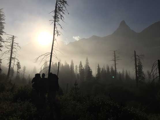 Sun rising behind the thin layer of morning mist. Our group’s marching up