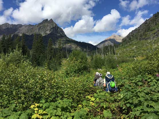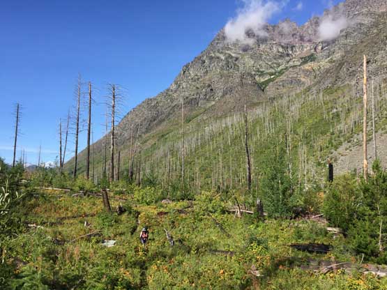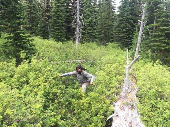 Connor bushwhacking in the typical Glacier brush
