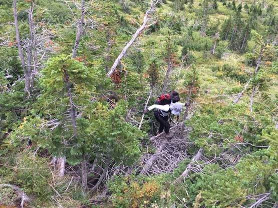 Asaka thrashing through some krummholz