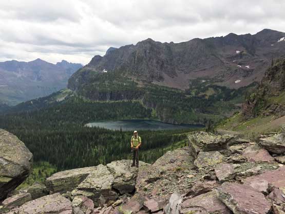 Adam posing on the boulder field with Buffalo Woman Lake behind