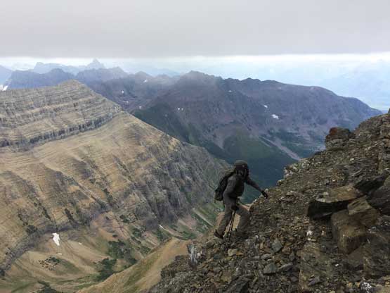 The monstrous massif of Mt. Stimson, the second highest in Glacier National Park of Montana rises 2000 vertical meters above the remote Nyack Creek valley in the south-western corner of the park. This peak may not be “difficult” from technical perspective, but the access is an ordeal no matter which route to take and because of that, this peak has reputation of being a tough bastard. This peak is one of the 100+ “P4K” (peaks with 4000 feet of prominence) in contiguous US and also one of the six 11,000ers in Glacier National Park. There are four ways to approach the low saddle between Mt. Stimson and Mt. Pinchot and all require suffering. After getting there, the standard route, SE Ridge is nothing but a “3rd class” scramble on some typical Rockies choss, but remember, one has to get there first…