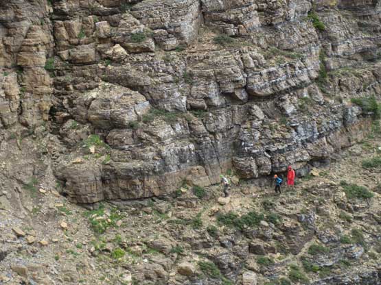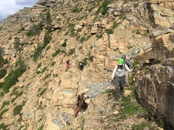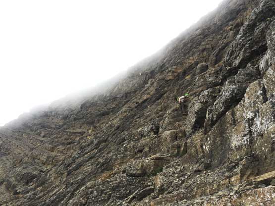 A zoomed-in shot of Adam, Asaka and Sean on a tiny stretch of the NW Face traverse