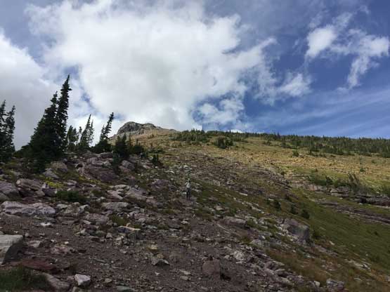 Adam descending the typical terrain on the upper route