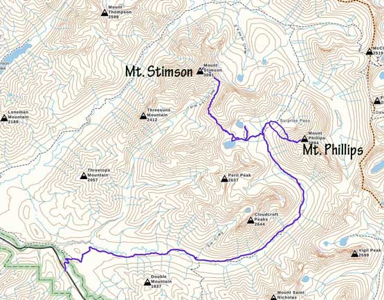 Mt. Phillips and Mt. Stimson via Coal Creek approach. GPX DL