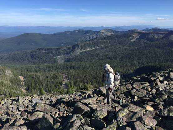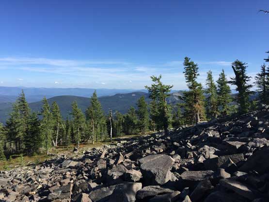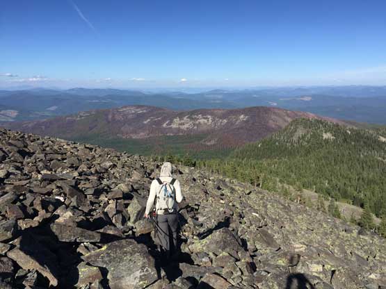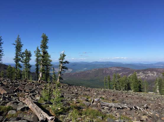 From the trail-head the ascent was about 5 km each way with over 500 m elevation gain, all on a maintained trail. The hike was very boring with minimal views through the thinning forest, but near the summit we broke out of the forest with expansive vista towards all direction. The mountains in this region are more “hills” than “peaks” but I was happy to see something different nonetheless. I could point out Mt. Fisher way the hell to the NE in Canadian Rockies which is the closest peak I’ve bagged, over 100 km away.
