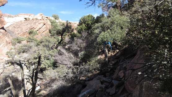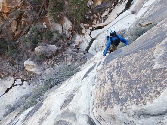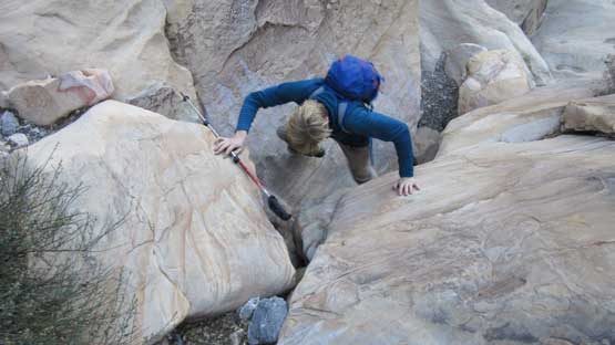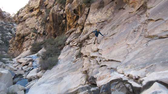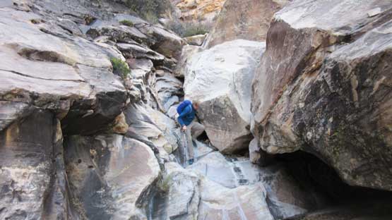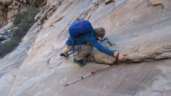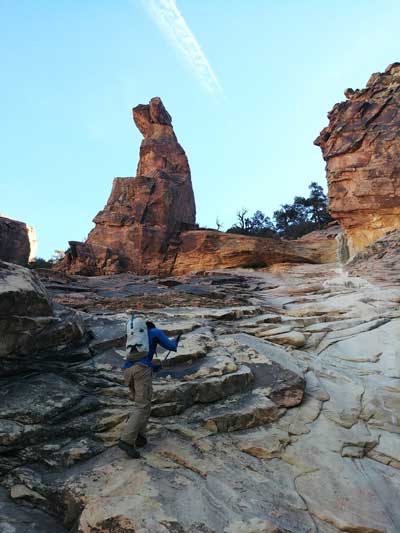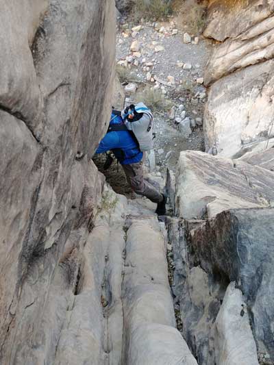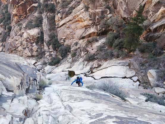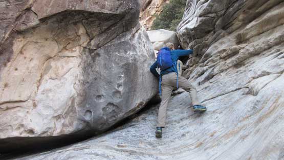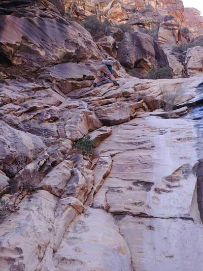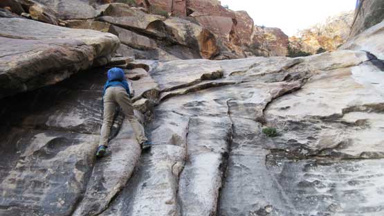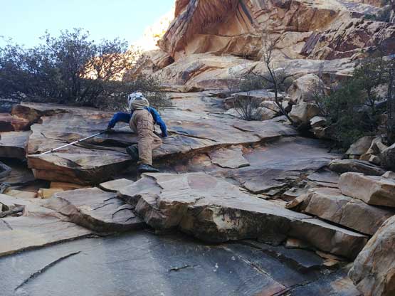 The route essentially goes up the “middle fork of Oak Creek Canyon” and it is this upper stretch that offers the greatest challenge. There’s plenty of 3rd and 4th class steps on the slabby water worn sandstone. We might not have noticed much on the ascent but the descent would be a different story with lots of difficult moves. Generally speaking if encountering 5th class climbing then detour and look for options on the climber’s right side wall. The crux comes towards the end where we had two choices. The 5th class section is now aided by a fixed rope on the left side but we opted to climb the 4th class bypass on climber’s right. There’s one or two exposed and awkward friction moves and because of that we decided to use the rope on descent.