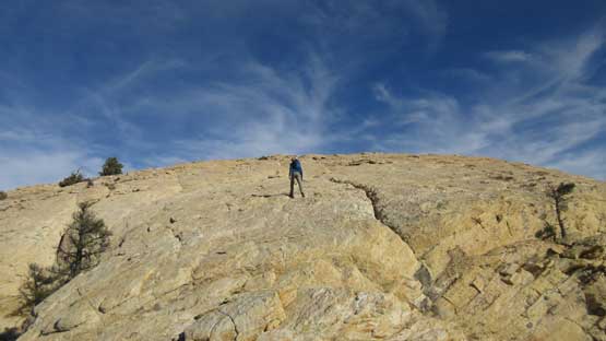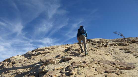 Following the upper canyon trending climber’s left (south) we got to deal with more slippery slabs but now the gradient had eased off. What’s left was mostly a pleasant walk on the slabs with nothing overly challenging, although we still had plenty of route-finding to do. Consulting with the descriptions we aimed our bearing towards the base of an “obvious pinnacle” and then onto a rib feature. This place marks the transition from the red sandstone onto the upper limestone cap. It’s confusing whether or not we should continue up this rib but at this point there wasn’t much we could do other than following the basic instinct.