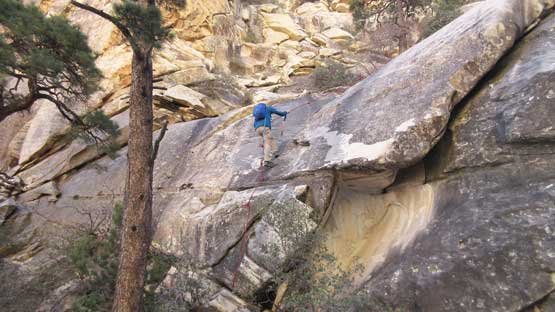 About half an hour was spent there soaking in the views. Eventually we had to face the descent. For the upper mountain we pretty much just reversed our route side-hilling across the vegetated plateau descending into the upper Oak Creek Canyon. At the supposed crux we stayed on down-climber’s right (south) side and found that fat batman rope. The bottom two meters turned vertical and overhanging but this wasn’t our first time using a batman rope to descend so the task wasn’t difficult. The actual crux turned out to be a section of 4th class smooth water worn slabs with virtually nothing to grab onto. I’m pretty sure on the ascent we just motored up using momentum without giving much of a second thought but the down-climb was far more difficult. Jake’s much more confident than me on rock climbing but even him had to spend some time to figure the sequence out. The initial few moves are the worst and I simply could not commit to that. I then spent about half an hour trying around all forms of strategy but eventually committed to a line on the far down-climber’s right (with rock shoes). The exposure was slightly higher but at least there’s some face holds to grab onto. When it comes to friction climbing I really suck and I don’t have much experience at all.
