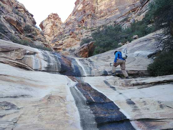 The route essentially goes up the “middle fork of Oak Creek Canyon” and it is this upper stretch that offers the greatest challenge. There’s plenty of 3rd and 4th class steps on the slabby water worn sandstone. We might not have noticed much on the ascent but the descent would be a different story with lots of difficult moves. Generally speaking if encountering 5th class climbing then detour and look for options on the climber’s right side wall. The crux comes towards the end where we had two choices. The 5th class section is now aided by a fixed rope on the left side but we opted to climb the 4th class bypass on climber’s right. There’s one or two exposed and awkward friction moves and because of that we decided to use the rope on descent.