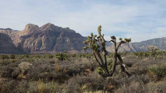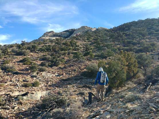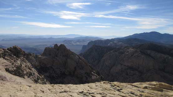 As far as I know there are at least half a dozen “Mt. Wilson”s across the western North America so not to be confused with the other ones I have to point out at first, that this “Mt. Wilson” is located just to the west of Las Vegas and is the highest point in Red Rock Canyon NCA. It boasts a shear east face that attracts almost everybody visiting the area but the west side is nothing fancier than a gentle walk-up on forested slopes. This isn’t a “prominence peak”. And thank to the proximity to Las Vegas’ urban development Mt. Wilson offers countless routes but from a scrambler’s perspective only two make sense. The standard route goes up First Creek Canyon (3rd class) from the south while a more interesting and direct option goes up Oak Creek Canyon from the north (4th class).