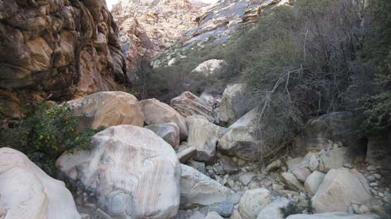 The beginning of this canyon was bushy if you miss the trail. There’s some confusion but we decided to trust the foot paths traversing high on the north bank. This turned out to be actually the correct call as the trail then descends back into the canyon floor and now we got to start the fun parts. The boulders were huge in the canyon and to scramble over, or around some of them required 3rd class moves and sometimes with exposure. At the first major junction we took the left turn and then at the second junction we had to make a choice. The left (south) branch leads into an amphitheatre and then further up the Cleaver Crack (4th class) but neither Jake nor I had done much research. The right fork continues up Oak Creek Canyon and seems to fit with the descriptions we had.