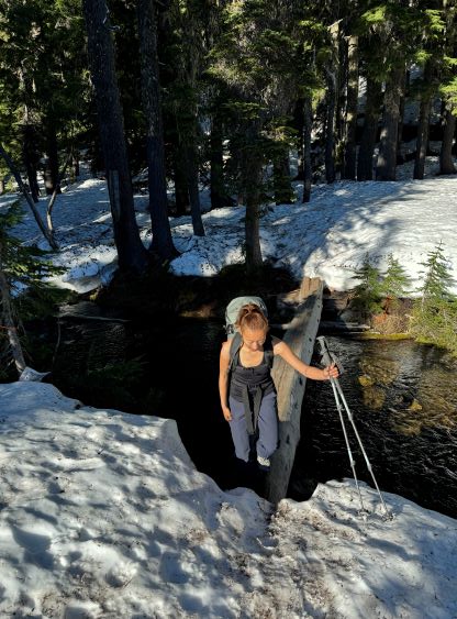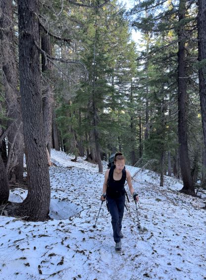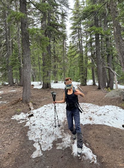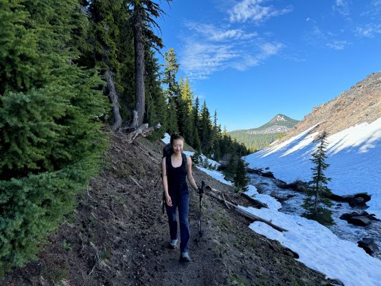 We were not able to cross the border until 9 pm on Tuesday evening and the forecast showed the best weather window was in the morning, so we had to push through the night without much sleep, if any. The driving would take 8 hours and I did take me 8 hours to get us there. I made two stops both in Washington for gas, and then took another half an hour “forced” break near Mt. Hood due to road construction. I cruised us down Highway 97 towards Bend in daybreak and eventually made to Green Lakes trail-head at exactly 5 am. The final half an hour was rough as I had to fight hard against fatigue but I managed to stay awake somehow. Erica was sleeping throughout most of the drive so the moment she woke up we were already at the parking lot. I did spend another hour at the trail-head to recollect myself as I was completely exhausted, but after forcing in some food we were able to start the day more or less as planned.