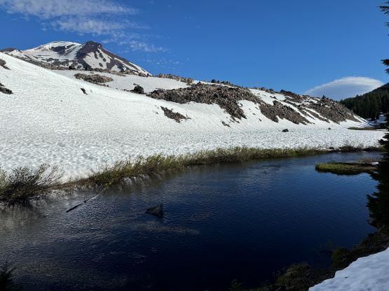 The 7 km hike to Green Lakes was harder than expected mostly because of the conditions. There was some horrendous mosquitoes at the trail-head and along the lower half of the approach trail, but what made things annoying was the snow. The condition still felt like May than late June with consistent snow coverage for much of the approach. I had opted to wear the Ortholite approach shoes but was forced to swap footwear to mountaineering boots not far in. My pack was quite heavy with the snow and rock gears and I was feeling the lack of sleep. We eventually followed the footprints to the still-frozen Green Lakes but the footprints stopped after that. I led us breaking our own trail towards the high saddle on the NW Ridge of Broken Top and because of the snow coverage we did not try to follow the existing “trail”. Another break was taken under the ridge to swap footwear back to the approach shoes as the ridge itself appeared dry. I was already exhausted and was not keen to haul any additional gear.