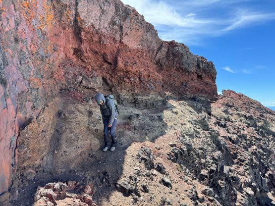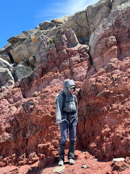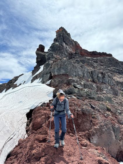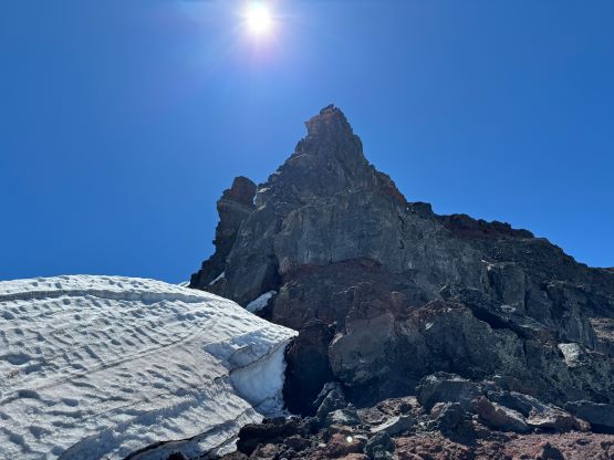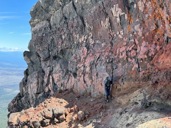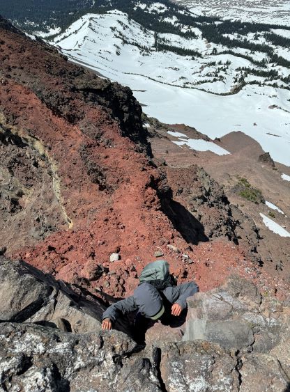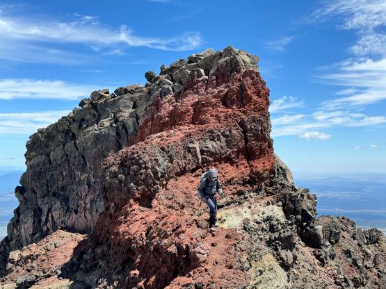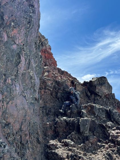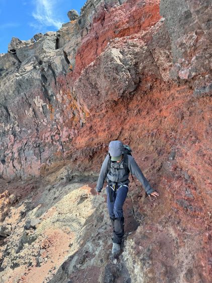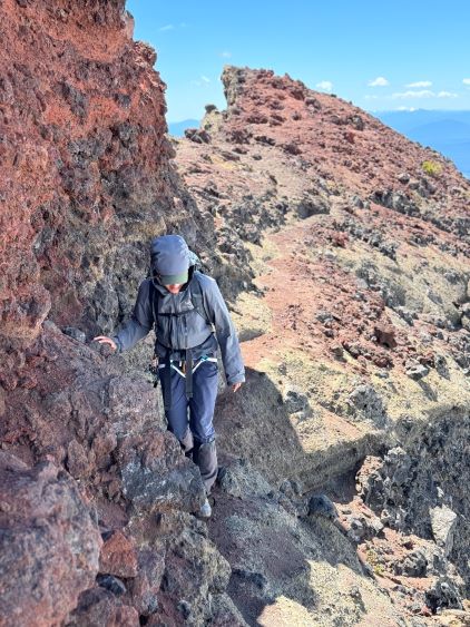 After dragging our tired selves onto the NW Ridge we were hammered by the winds, but we came prepared for that. The wind was not cold, but strong enough to make us don some layers. The condition was actually more tolerable than I thought, as we never felt being pushed around too hard. The ridge itself was quite easy with a path here and there, but the view was foreshortened. It took us a long while to eventually slog to the base of the scramble. The initial crux was a short 5th class step but I knew there’s also a 3rd class gully bypass on the climber’s right side. I opted to climb the nose directly as it looked fun, but it turned out a bit harder than I thought. I was glad to have brought a rope for Erica to follow, and we planned to rappel this step on the descent. The “cat walk” afterwards was quite chill as it was just a walk on a somewhat exposed ledge with some loose pebbles, and the final scramble to the summit was also quite straightforward. The position of the “cat walk” made for some very cool photos and videos and Erica greatly enjoyed her first ever volcano.