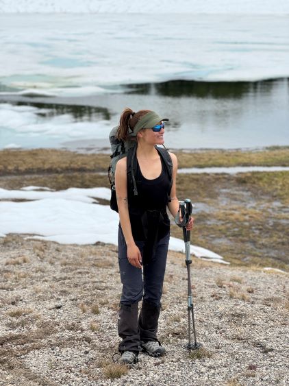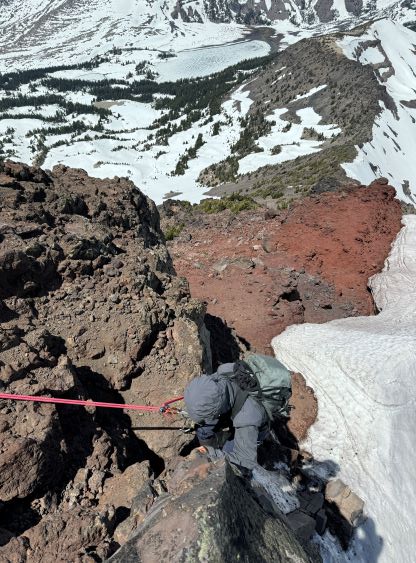 Due to the winds we didn’t spend too much time on the descent, but we did explore the ridge a little bit on the descent. I scrambled up another rock pinnacle on the ridge for fun. We then dashed back across the “cat walk” and then made the rappel down that nose step. This was Erica’s second ever rappel and the first on rock. We had previously discovered a sheltered spot on the ridge and used that spot to take a lunch break, and then dashed back to the saddle where we ditched the boots. The winds were pushing us on the descent. The experience was not pleasant but I thought this was also a good training trip for the high winds at altitude. There were a few groups of hikers at Green Lakes to the trail was much more packed on the way out for us, but it was still a slog in the sloppy snow. The mosquitoes were worse so after I swapped footwear back to the approach shoes we jogged back to the parking lot.
