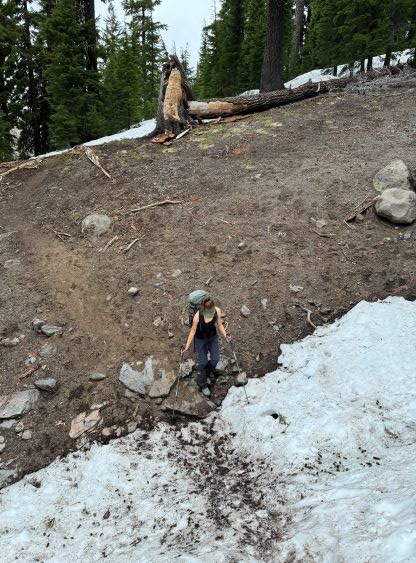 We were not able to cross the border until 9 pm on Tuesday evening and the forecast showed the best weather window was in the morning, so we had to push through the night without much sleep, if any. The driving would take 8 hours and I did take me 8 hours to get us there. I made two stops both in Washington for gas, and then took another half an hour “forced” break near Mt. Hood due to road construction. I cruised us down Highway 97 towards Bend in daybreak and eventually made to Green Lakes trail-head at exactly 5 am. The final half an hour was rough as I had to fight hard against fatigue but I managed to stay awake somehow. Erica was sleeping throughout most of the drive so the moment she woke up we were already at the parking lot. I did spend another hour at the trail-head to recollect myself as I was completely exhausted, but after forcing in some food we were able to start the day more or less as planned.