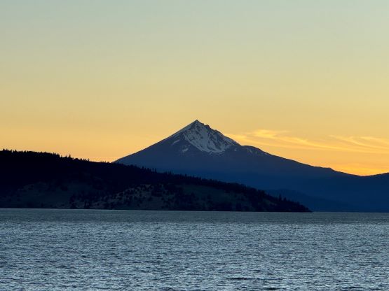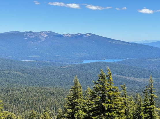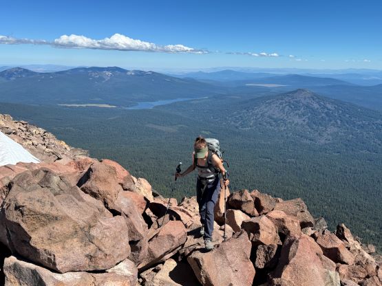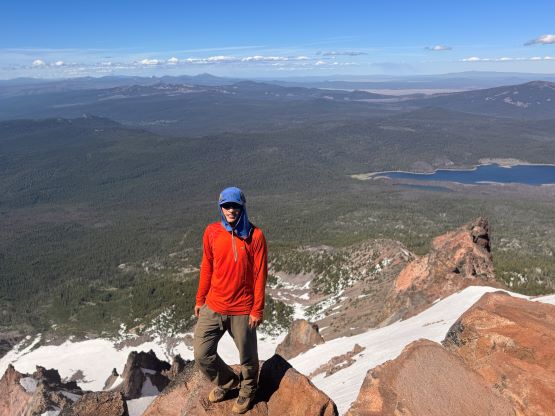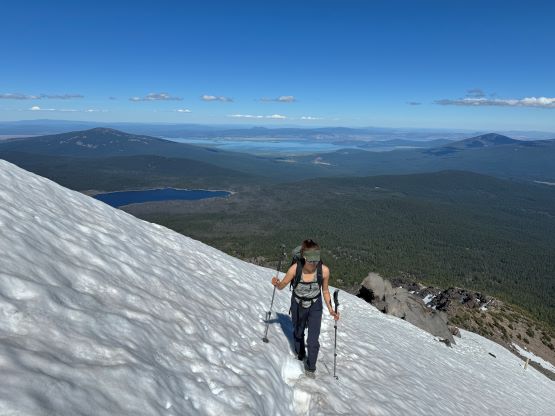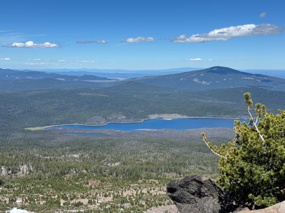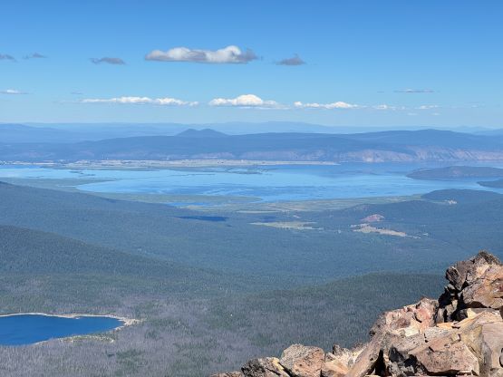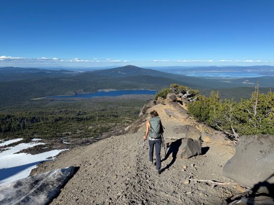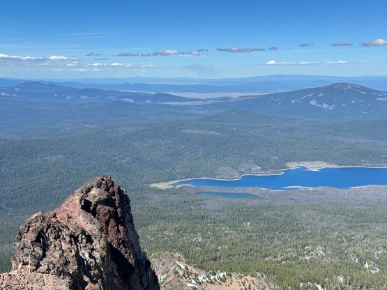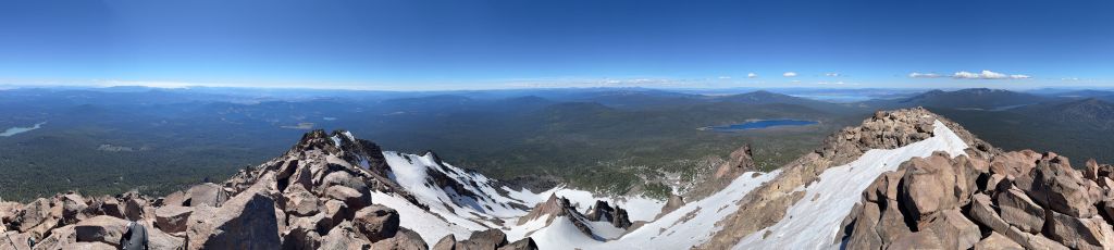 It was eventually the time to start descending, and I found the descent to be much more confusing. The terrain forced me to descend towards skier’s right away from the ridge and I had to consult with the GPS multiple times to correct our bearing. There were infinitely many paths though, and I do believe they would eventually all converge. The worst was still the final 2 miles of the distance, as the mosquitoes were even worse now. The first thing we did after getting back to the trail-head was to put on the jackets and the next thing was to hastily get into the car. We did the change of cloths in the car and then drove away. The next stop was somewhere along Highway 97 for some grocery, and then we drove further north to find a car-camping spot away from the streets. Our final objective on the following day would be Mt. Bachelor and that would help me finishing the “Cascade Volcanoes Peak Pin” list.