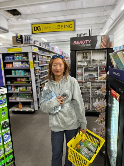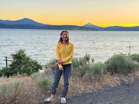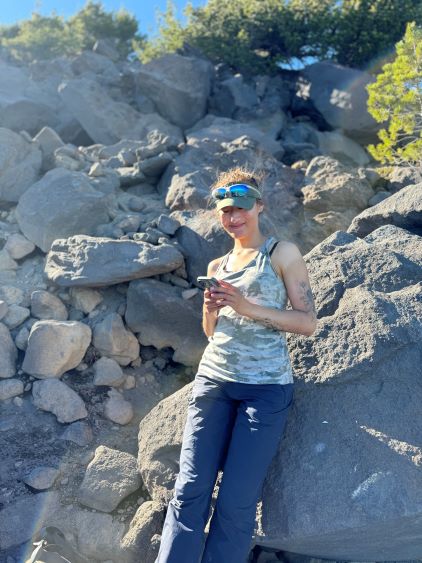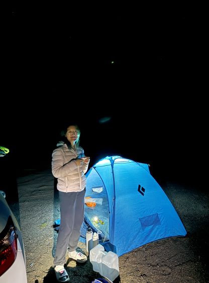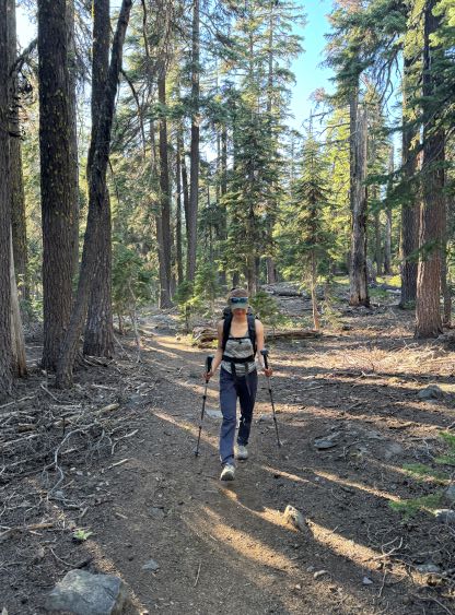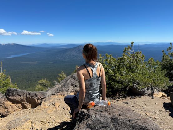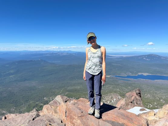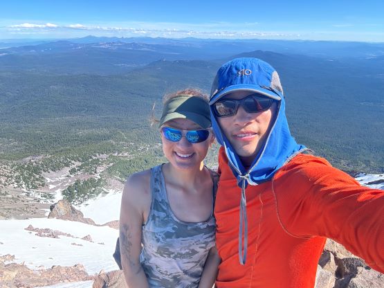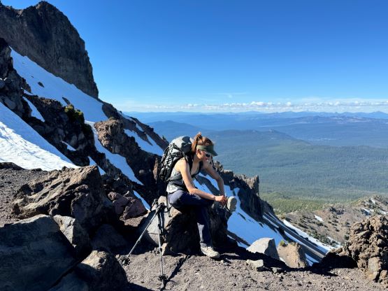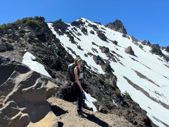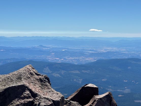 Mt. McLoughlin dominates the southern Oregon skyline and boasts over 1300 m prominence, but it’s small compared with Mt. Shasta further to the south in California, or the Three Sisters to the north. This is one of the easiest volcanoes in Oregon with basically a trail to the top. The upper slope does require some scrambling on boulders but the ascent is overall trivial. This was the 3rd day of the trip and earlier in the trip Erica and I had climbed Broken Top and Mt. Thielsen, and also paid a visit to Crater Lake. We were pushing ourselves quite hard in the previous two days and Erica also desperately needed to put some hours into her work, so she brought a laptop and we decided to spend the night in a motel. Erica had a meeting at 9 am so we both woke up very leisurely. The meeting ended up being longer than she thought, that we barely made the 11 am check-out time, and subsequently did not make to the trail-head until noon. The last few miles were gravel but imposed no problem to the Corolla. The mosquitoes were however, terrible at the trail-head so we both had to put on the jacket to prepare for our meal, despite the hot temperatures.