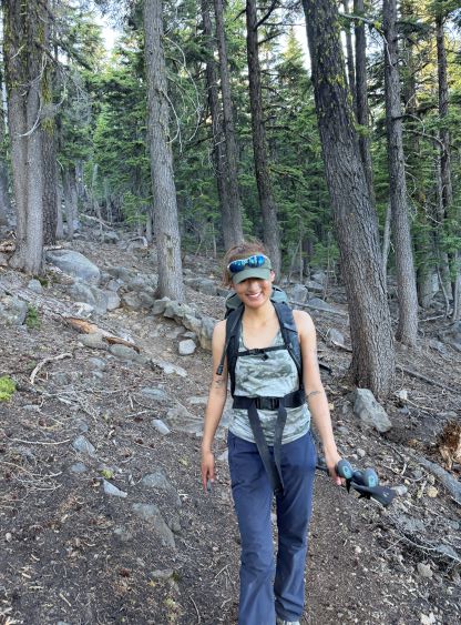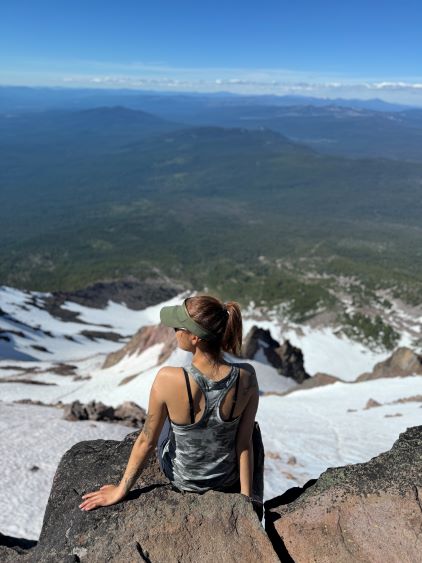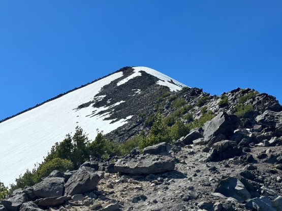 By 1 pm we finally started the ascent and the lower 1/3 of the route was a horror show of mosquitoes, as warned by the others on AllTrails etc. The hot temperatures did not help. Thankfully the situation improved drastically as we approached treeline. The mosquitoes died down and we were welcomed by some cool breezes. We encountered 3 or 4 descending parties including one with skis, and we were the last group to ascend on this particular day. There were a lot of paths to choose from and all went. We did have to do some boulder hopping and hands-on scrambling but I also didn’t pay too much attention to the route. This was overall a no-brainer type of ascent, and the highlight was the views from the summit. We spent almost an hour up there despite the lateness in the day. The snow crossing near the summit was trivial and we easily walked across in just the runners. We had brought ONE pair of crampons and ONE ice axe between the two of us just in case, but they were not required nor used.