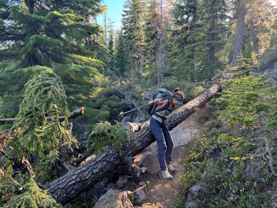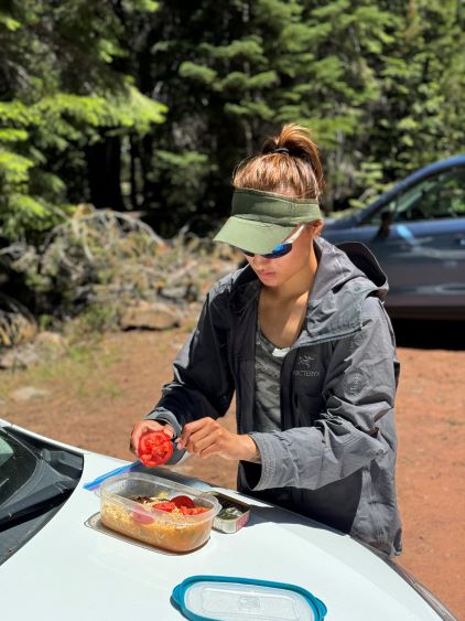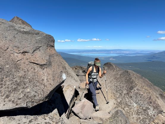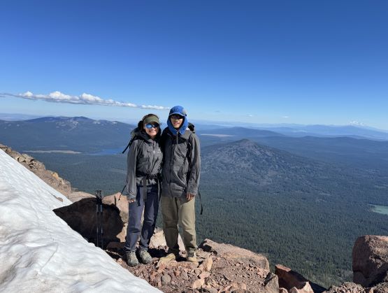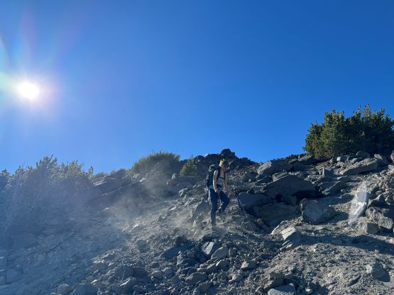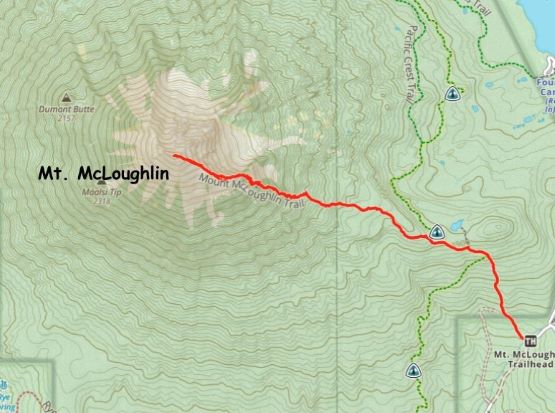 Mt. McLoughlin dominates the southern Oregon skyline and boasts over 1300 m prominence, but it’s small compared with Mt. Shasta further to the south in California, or the Three Sisters to the north. This is one of the easiest volcanoes in Oregon with basically a trail to the top. The upper slope does require some scrambling on boulders but the ascent is overall trivial. This was the 3rd day of the trip and earlier in the trip Erica and I had climbed Broken Top and Mt. Thielsen, and also paid a visit to Crater Lake. We were pushing ourselves quite hard in the previous two days and Erica also desperately needed to put some hours into her work, so she brought a laptop and we decided to spend the night in a motel. Erica had a meeting at 9 am so we both woke up very leisurely. The meeting ended up being longer than she thought, that we barely made the 11 am check-out time, and subsequently did not make to the trail-head until noon. The last few miles were gravel but imposed no problem to the Corolla. The mosquitoes were however, terrible at the trail-head so we both had to put on the jacket to prepare for our meal, despite the hot temperatures.