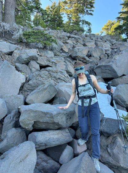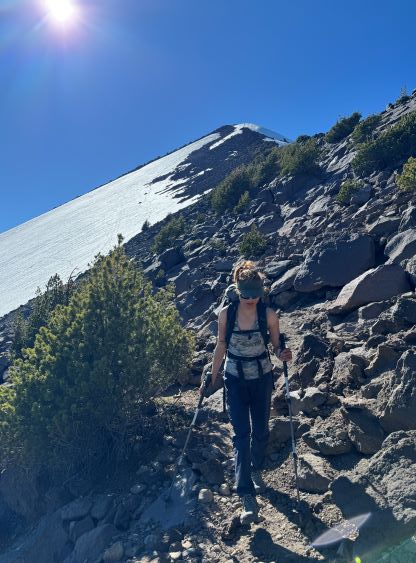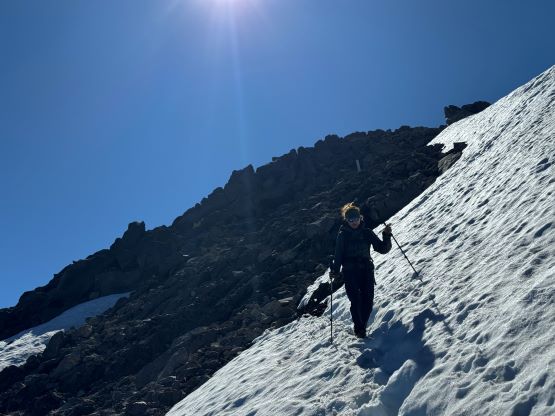 By 1 pm we finally started the ascent and the lower 1/3 of the route was a horror show of mosquitoes, as warned by the others on AllTrails etc. The hot temperatures did not help. Thankfully the situation improved drastically as we approached treeline. The mosquitoes died down and we were welcomed by some cool breezes. We encountered 3 or 4 descending parties including one with skis, and we were the last group to ascend on this particular day. There were a lot of paths to choose from and all went. We did have to do some boulder hopping and hands-on scrambling but I also didn’t pay too much attention to the route. This was overall a no-brainer type of ascent, and the highlight was the views from the summit. We spent almost an hour up there despite the lateness in the day. The snow crossing near the summit was trivial and we easily walked across in just the runners. We had brought ONE pair of crampons and ONE ice axe between the two of us just in case, but they were not required nor used.