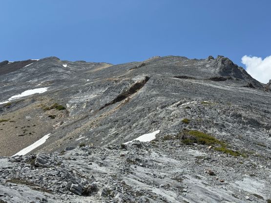 The grade petered out towards the end of this valley where the terrain resembles in the Rockies somehow. We stopped to fill up the water bottles and I made Erica and Seb to go ahead to tag the summit. I dragged my tired ass after taking a long break, but for the last 500 m elevation gain every step was a struggle. I eventually did drag myself to the summit but I basically used up all of the energy. I told the others to go to Matterhorn themselves, as I desperately needed to descend. Skipping a peak sucks and Matterhorn is the second highest peak in this range and only requires a couple kilometers of ridge walking, but I had to be realistic.